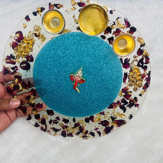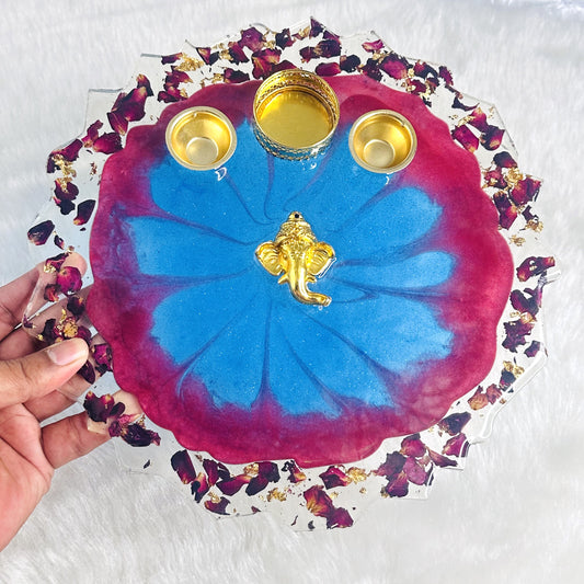 Ganeshji Pooja/Aarti Resin Thali | Blue | Rose Petals