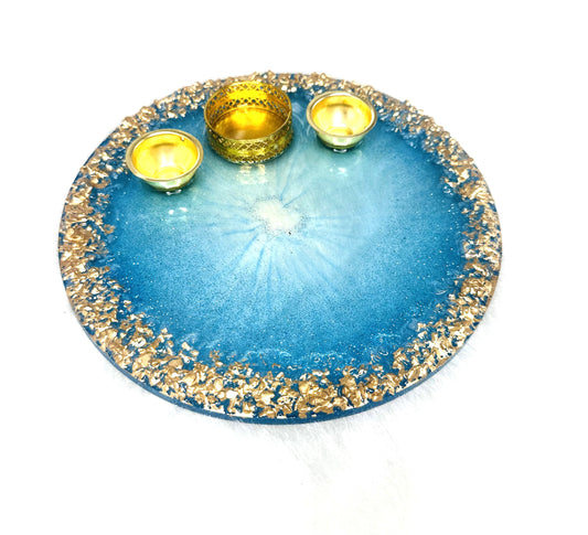 Pooja/Aarti Resin Thali | Blue Geode | Golden Borders