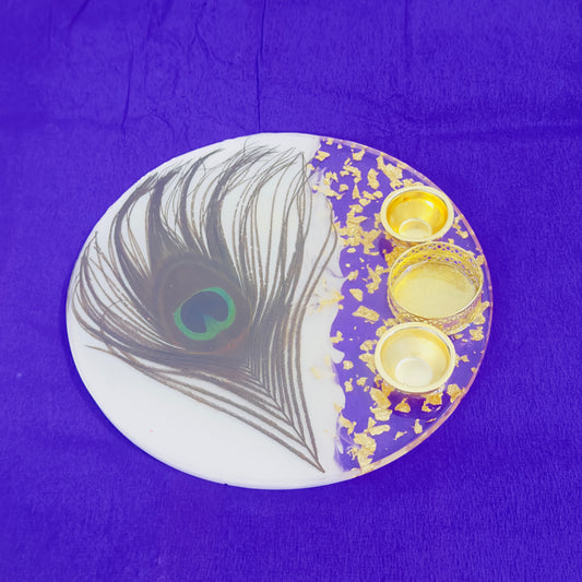 Pooja/Aarti Resin Thali | White with Peacock Feather
